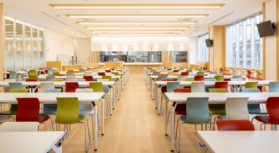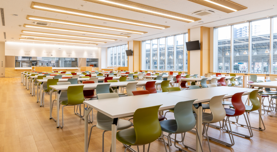 明るく開放的な食堂。営業時間外は学生の自習室として開放します。